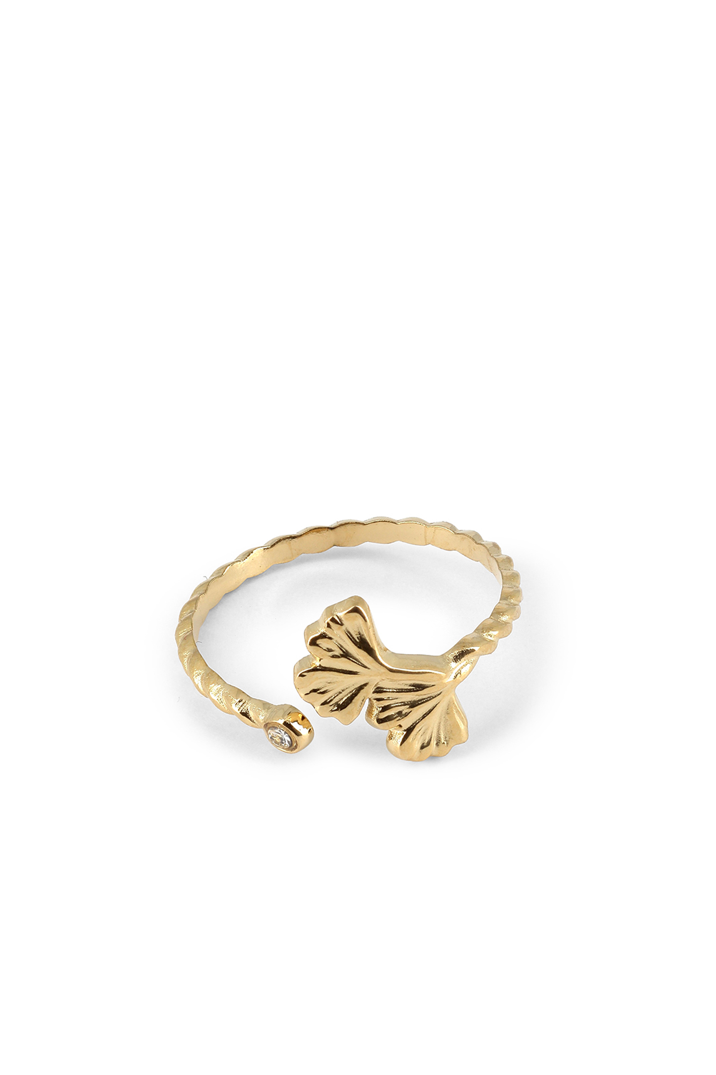 Bague fine, embouts cristal & feuille de ginkgo biloba