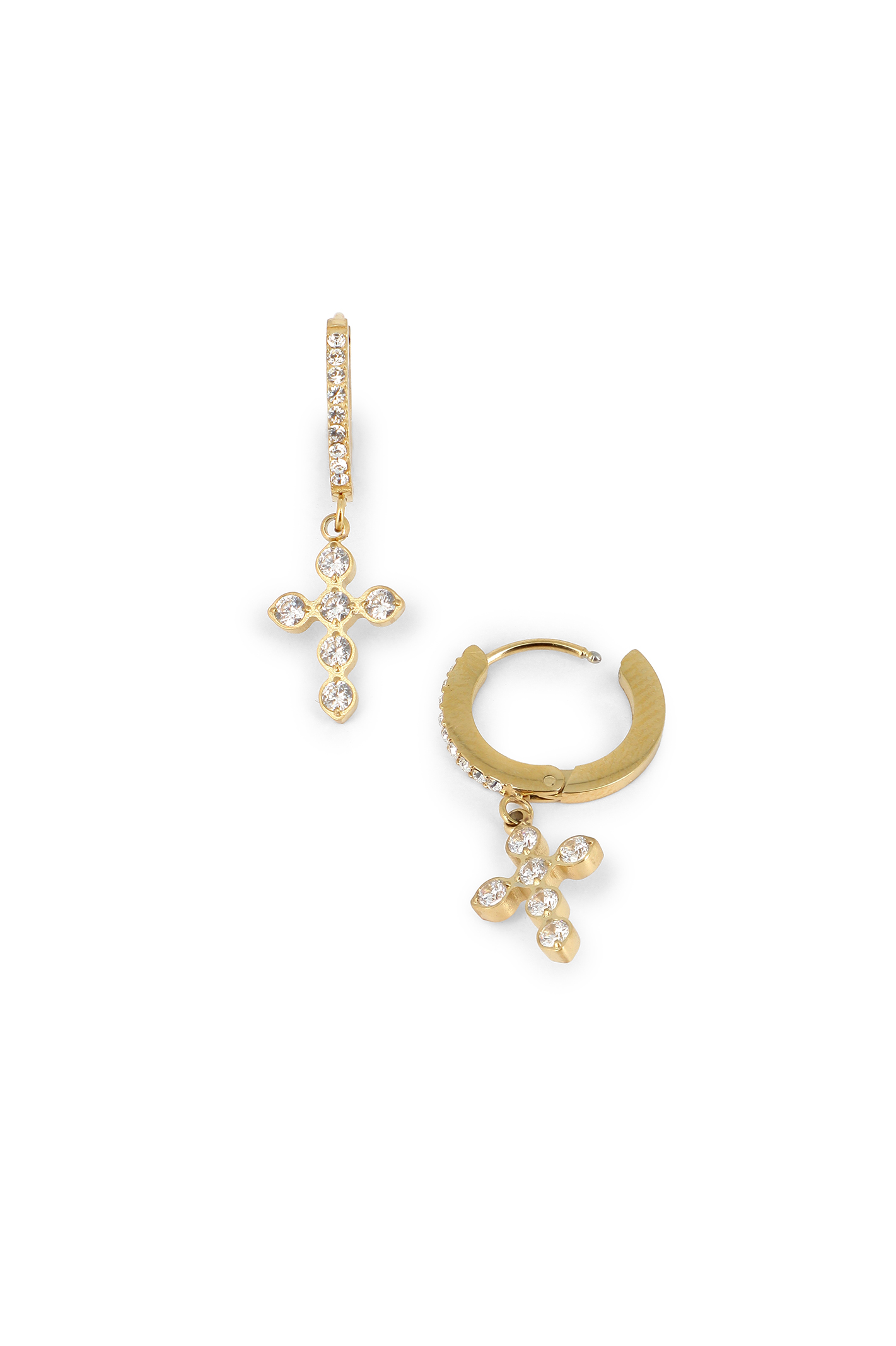 Boucles créoles clic ligne de strass, pampilles croix de cristaux