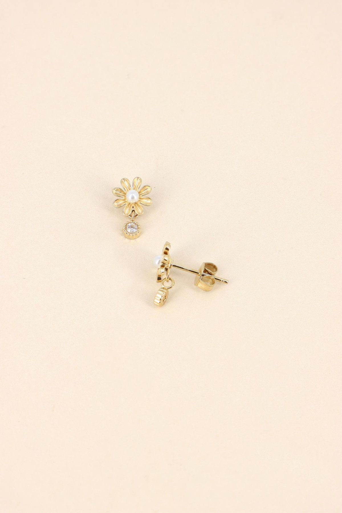 Boucles puces fleur, perle, & pampille cristal rond