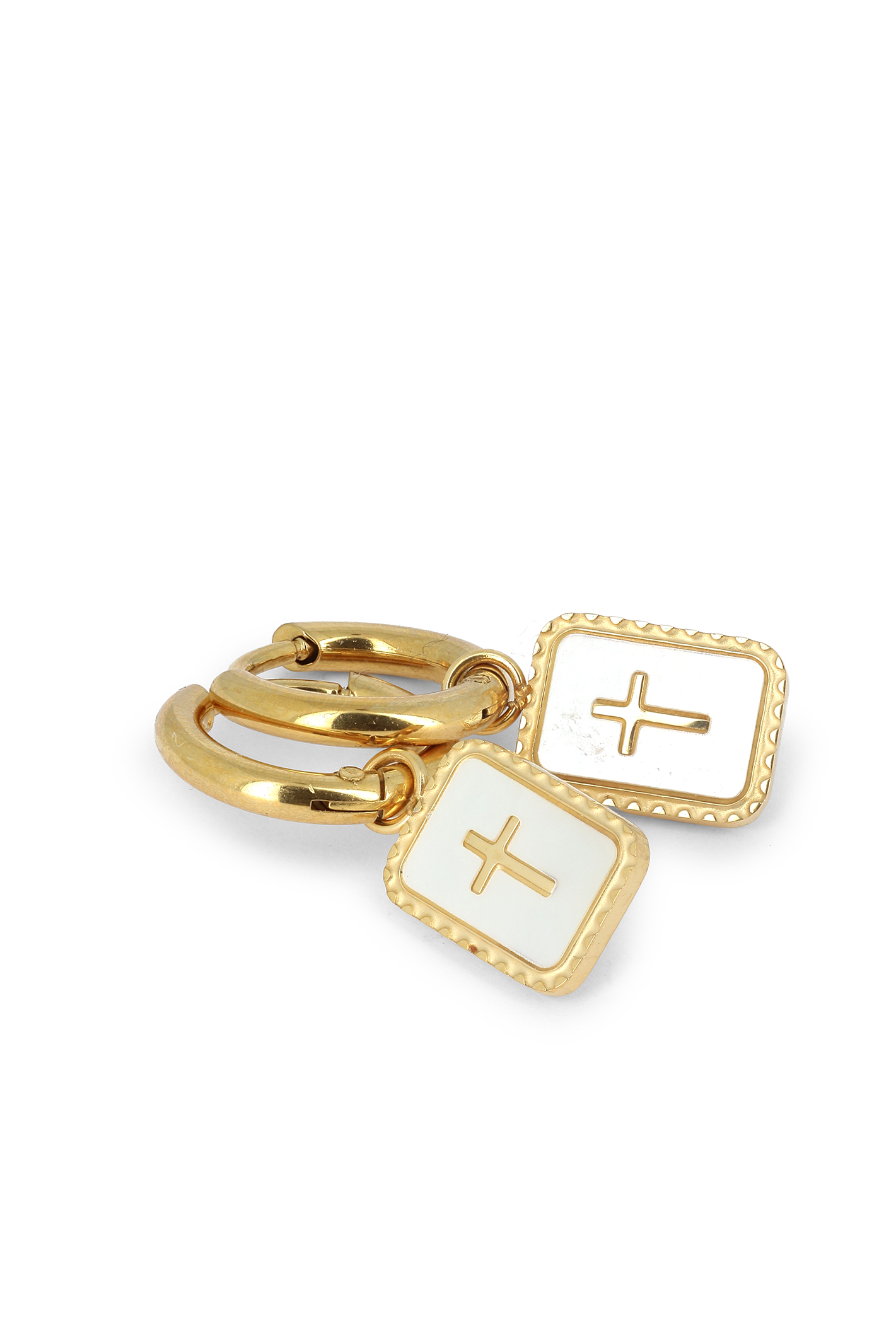 Boucles créoles clic & pampille médaillon rectangulaire nacré, croix centrale