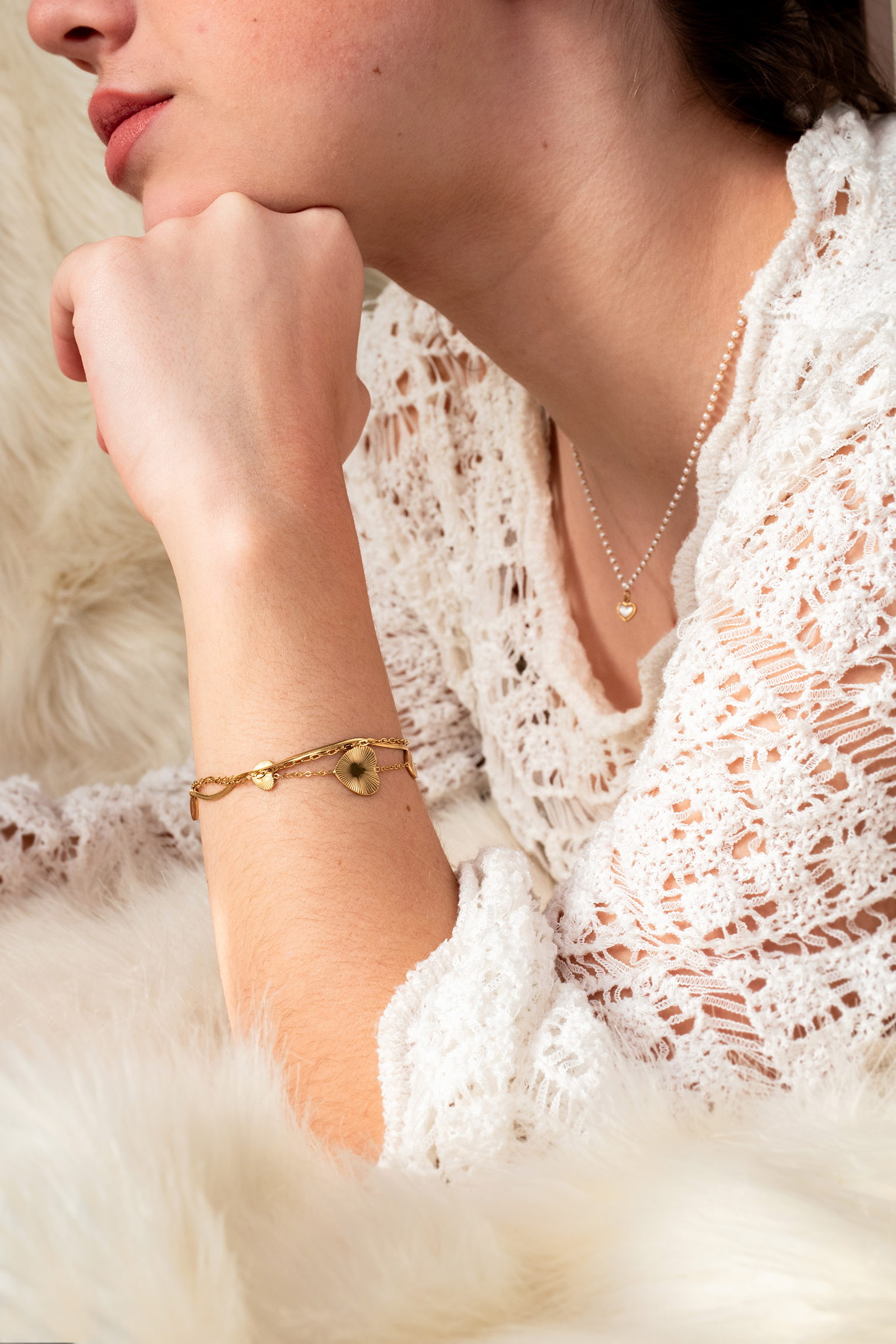 Bracelet multi rangs chaîne, maille plate, maille serpent & pampilles cœurs striés