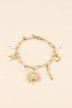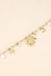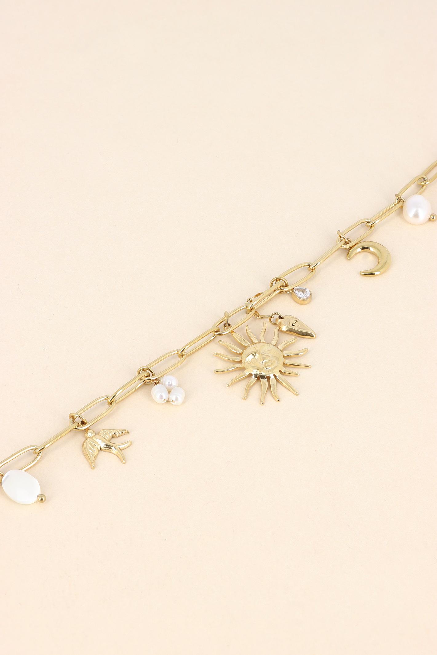 Bracelet chaîne grande maille plate, pampilles oiseau, lune, soleil, coeurs, perles d'eau douce & cristaux