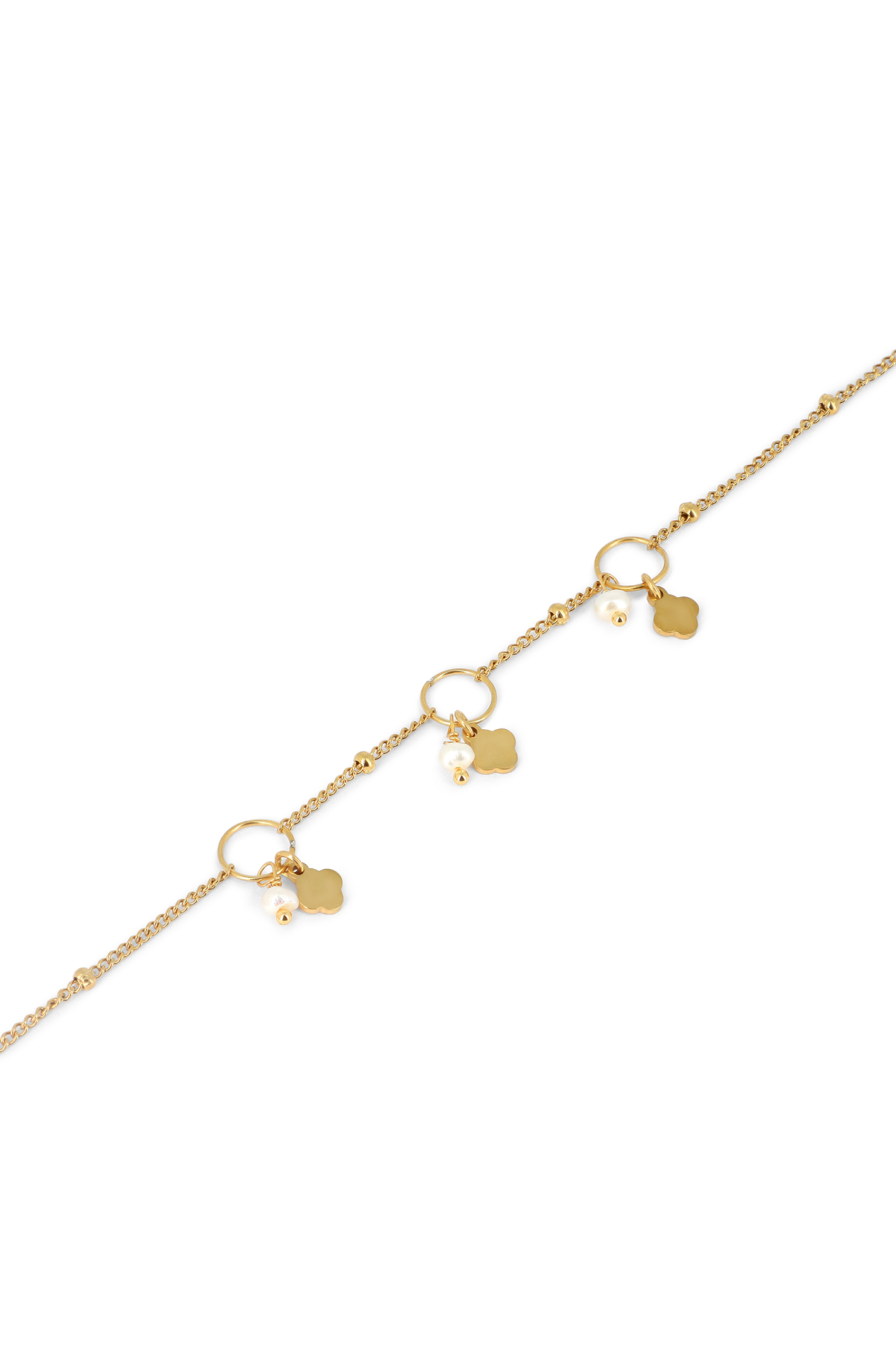 Bracelet chaîne fine boules, anneaux, pampilles trèfles lisses & perles
