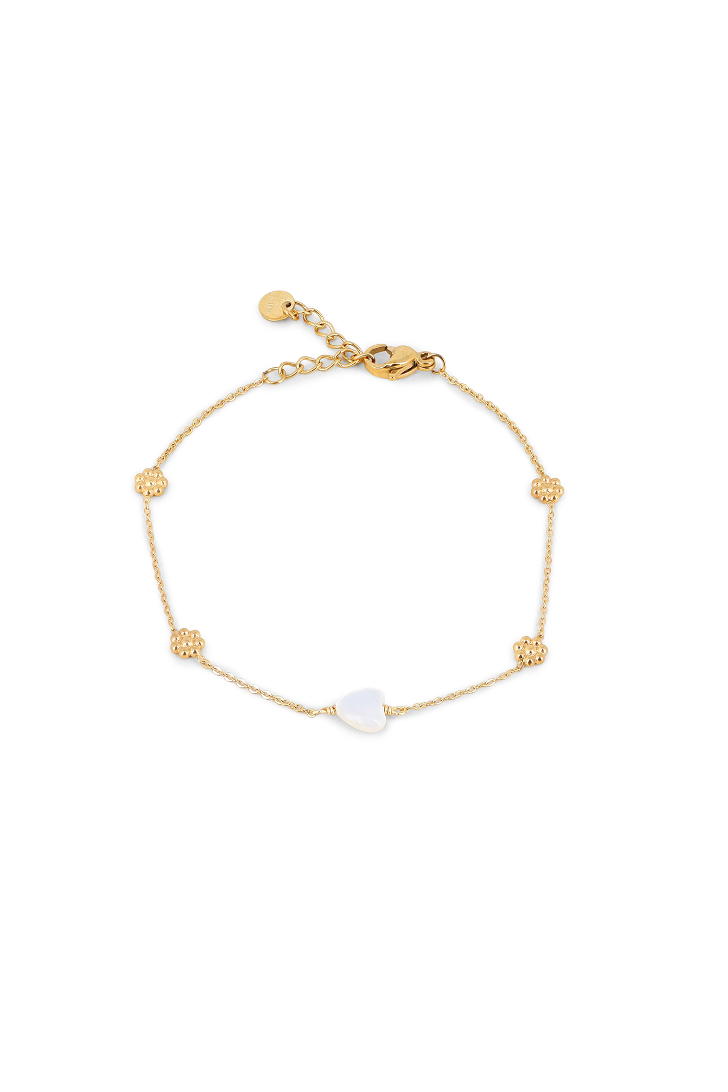 Bracelet chaîne, fleurs boules & cœur de nacre