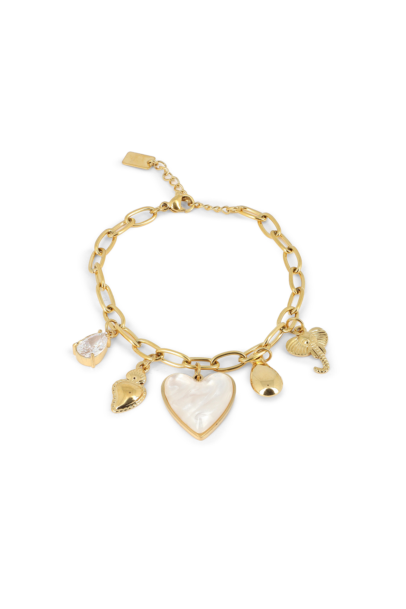 Bracelet chaîne pampilles cœur de nacre, ex-voto, éléphant & goutte de cristal