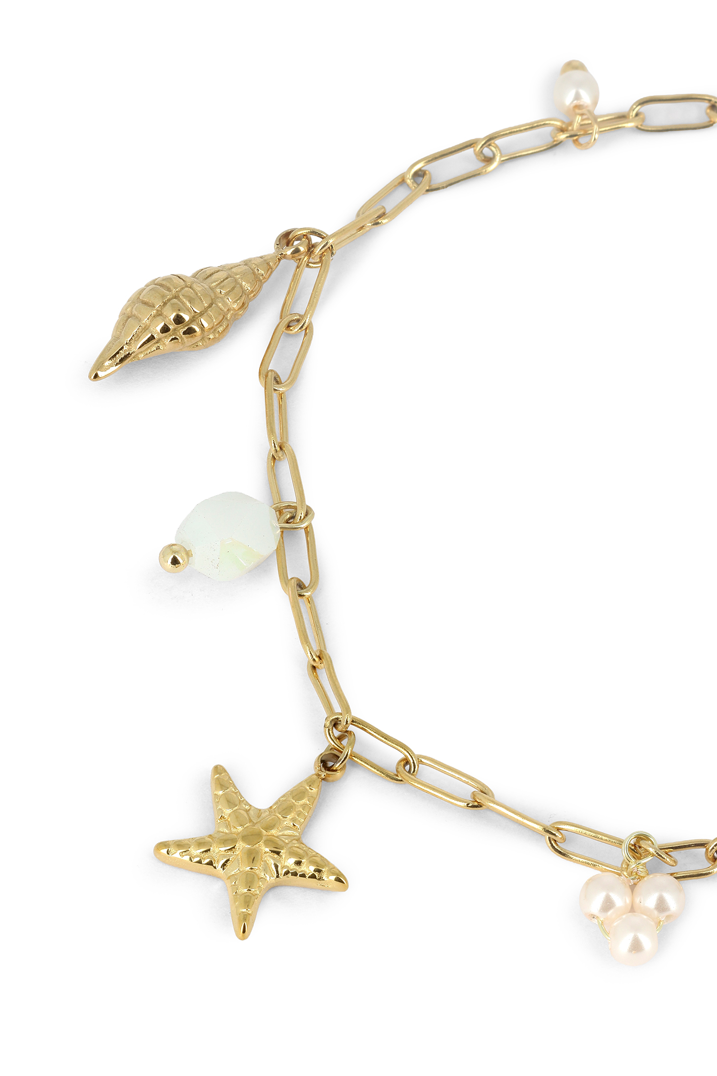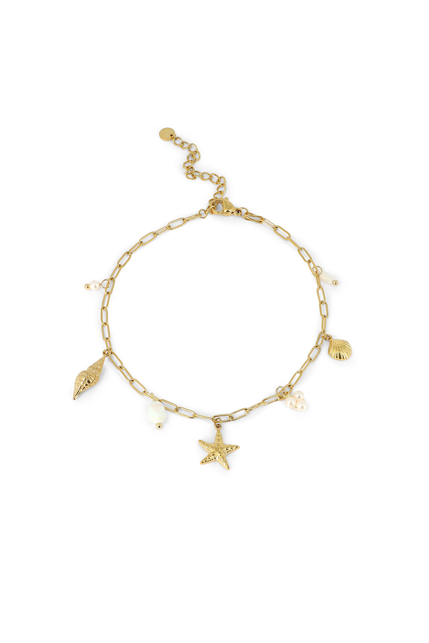 Chaîne de cheville maille trombone, pampilles étoile de mer, coquillages & perles