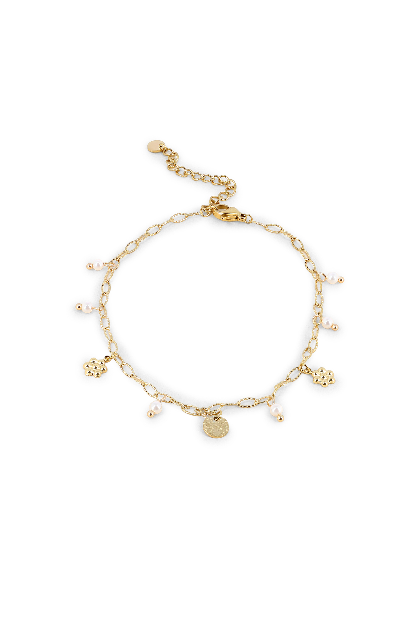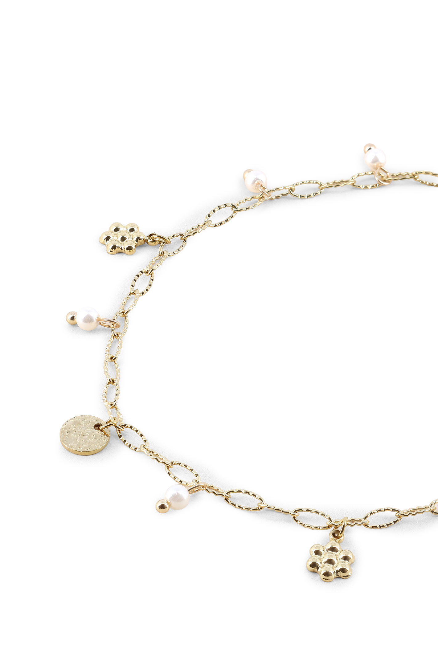 Chaîne de cheville fleurs boules, pièce martelée & perles