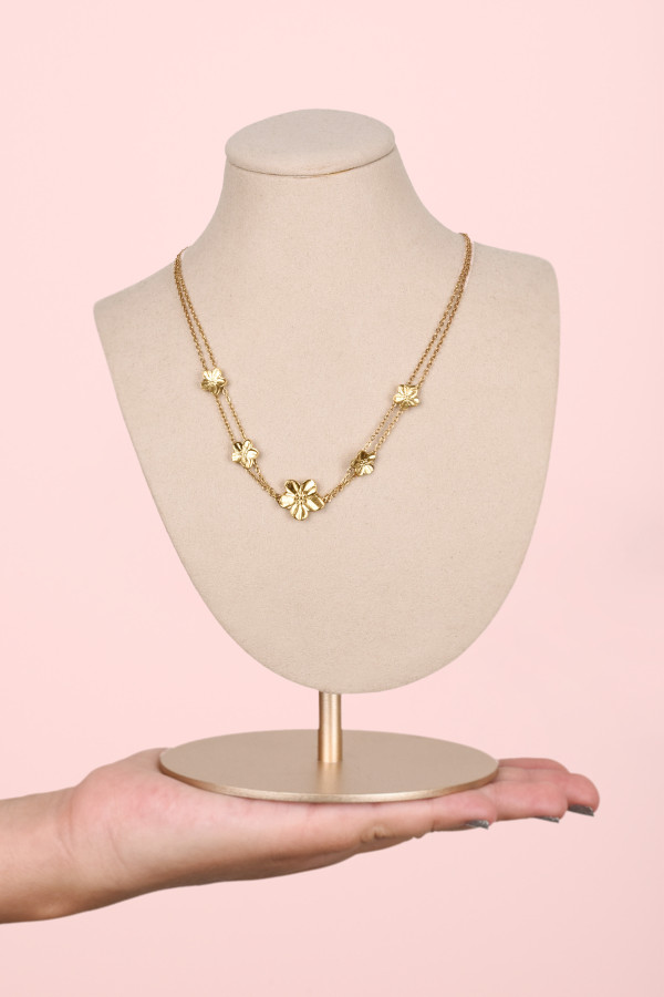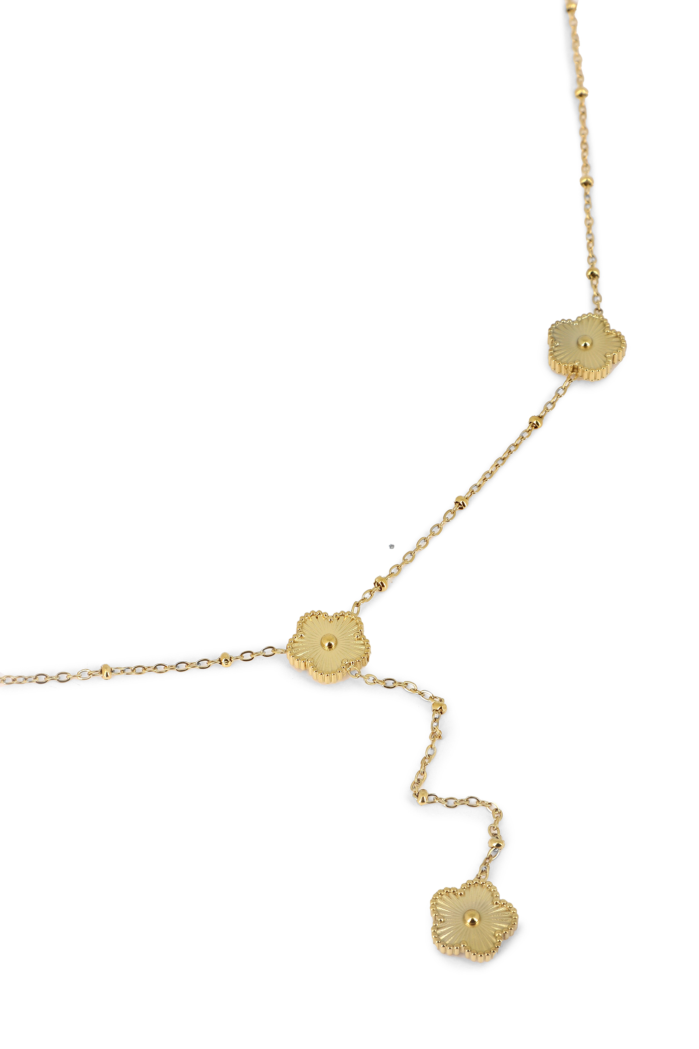 Collier Y chaîne maille boule & 4 fleurs striées