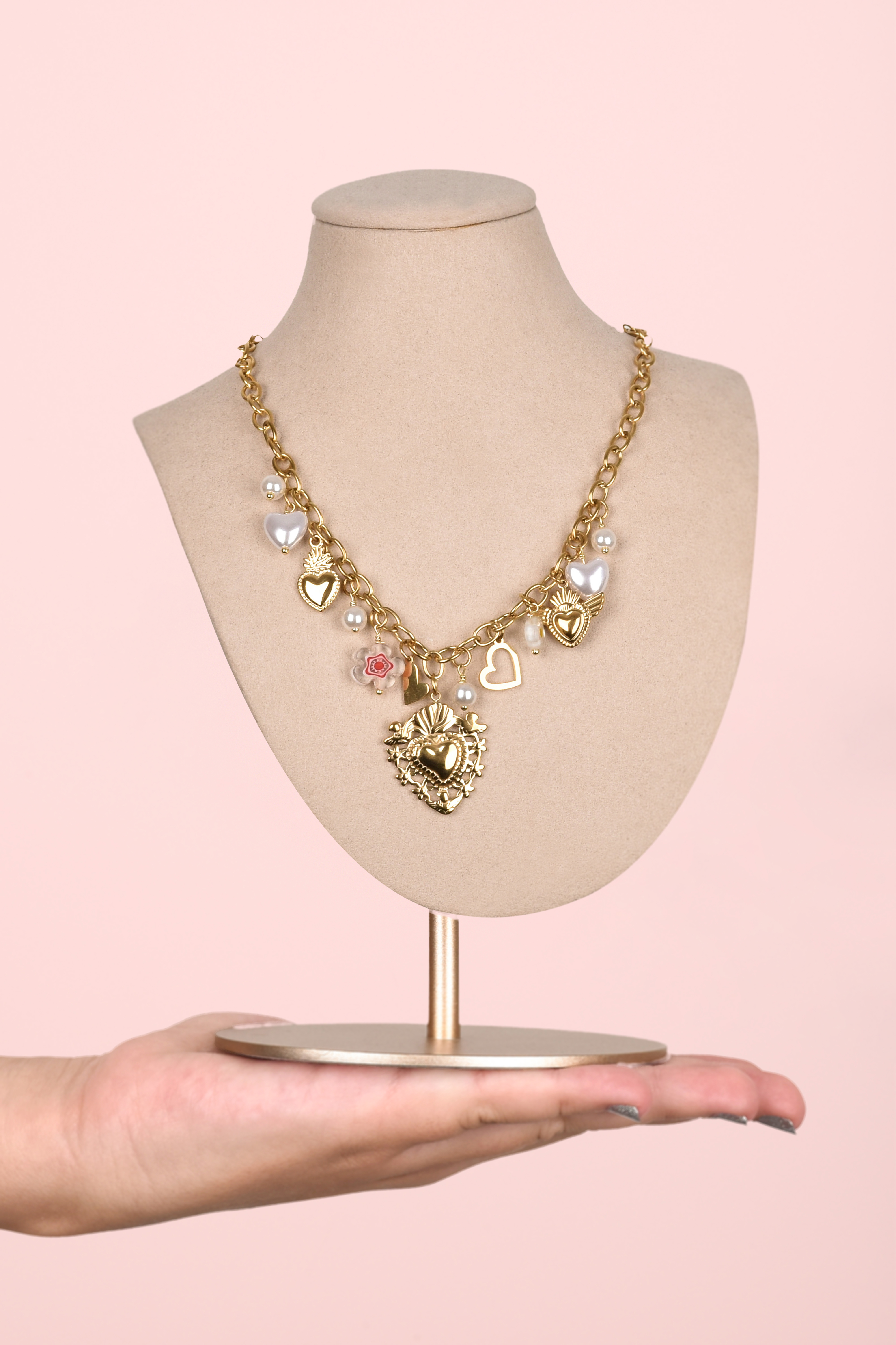 Collier maille, pampilles cœurs ex-votos, médaillons, fleurs & perles