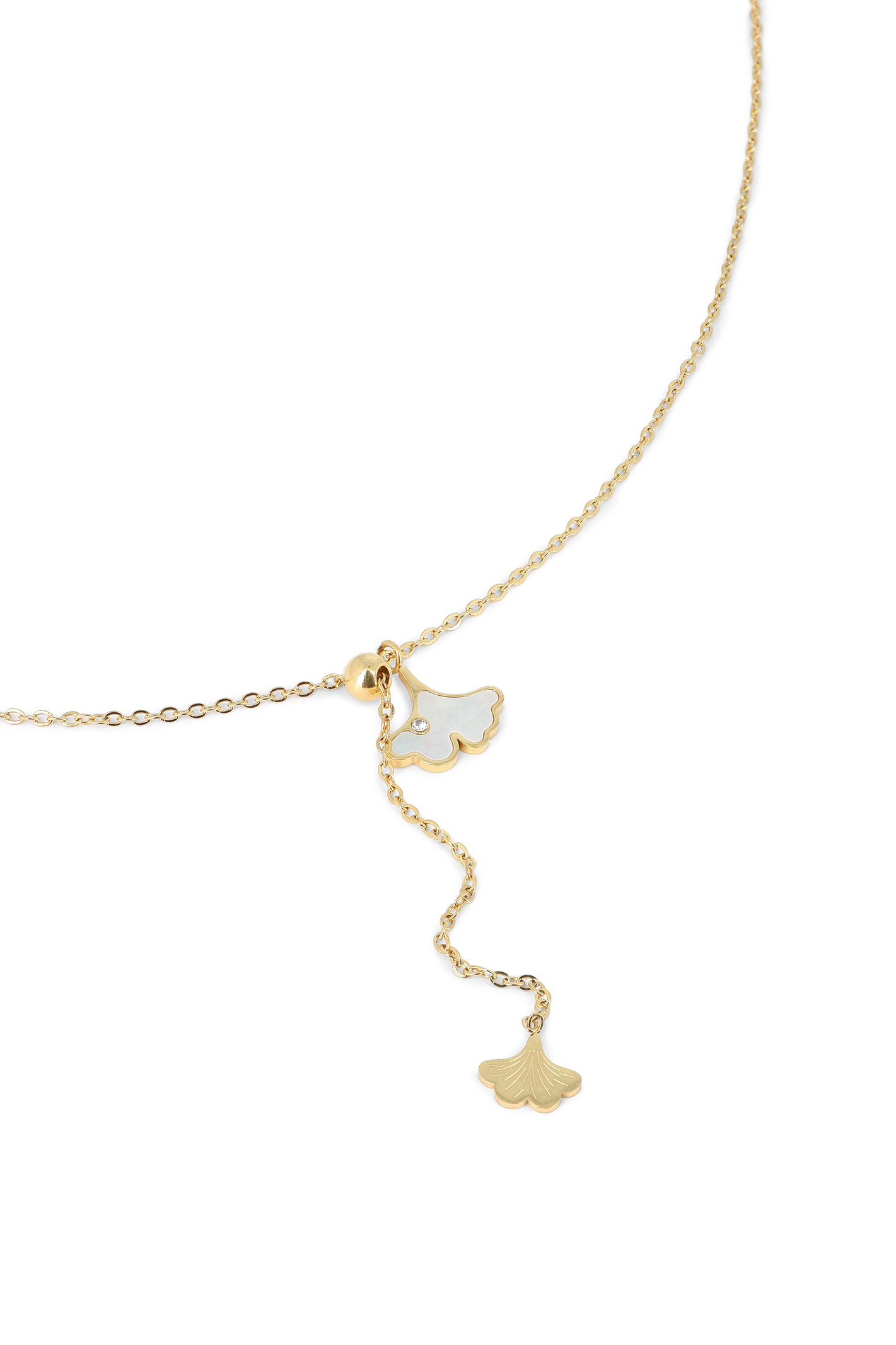 Collier Y, chaîne boule, pampilles feuilles de ginkgo biloba, nacre & cristaux