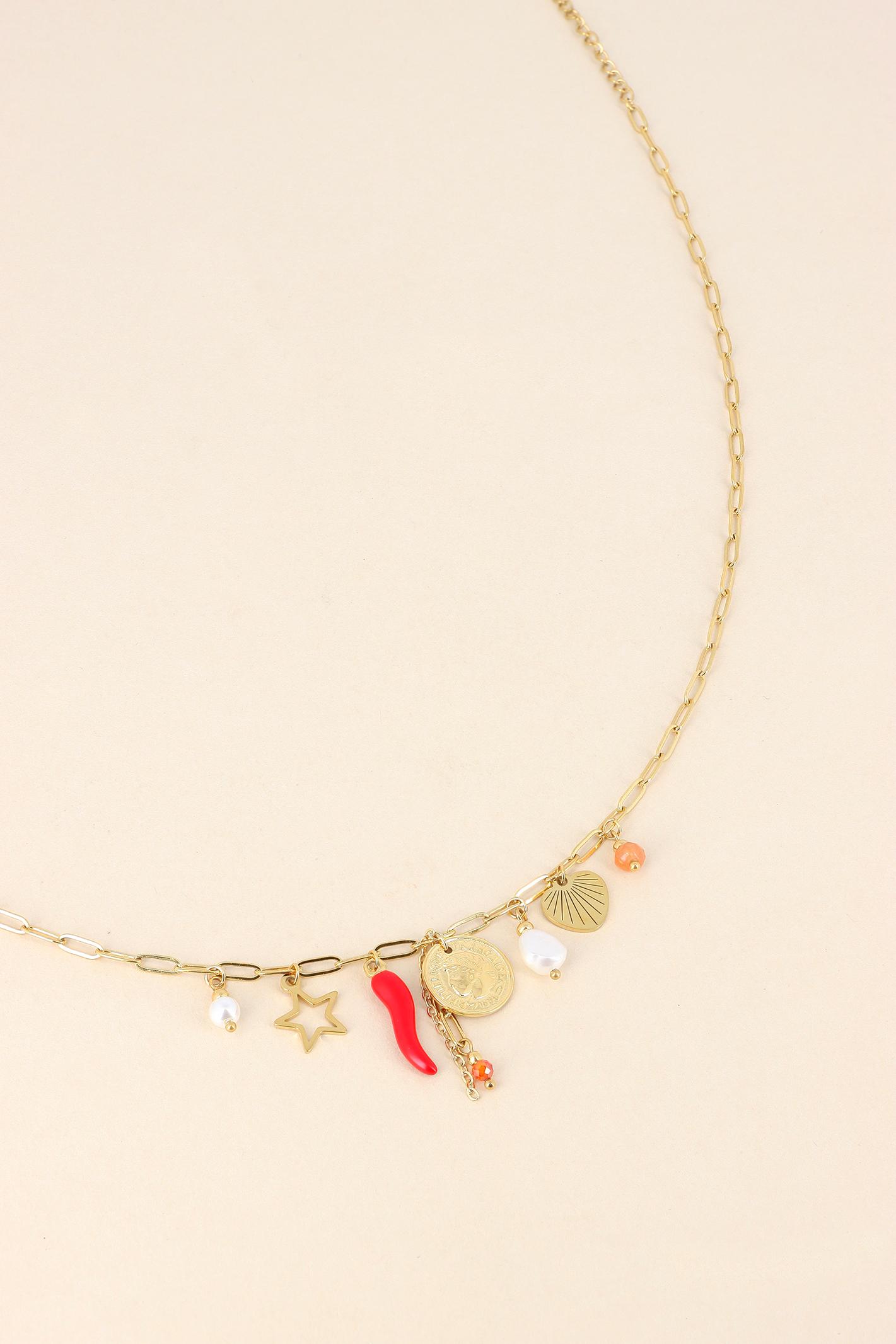 Collier chaîne pampilles médaillons, cœur, étoile, corne d'abondance & perles d'eau douce